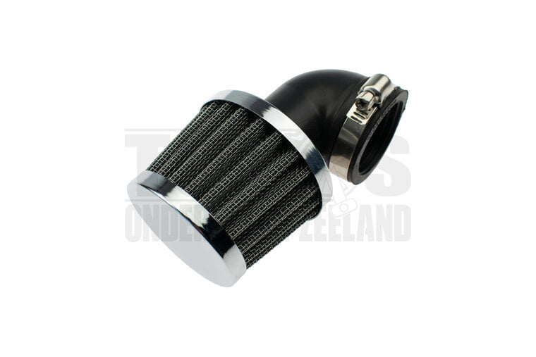 De Powerfilter Luchtfilter 35mm Chroom 90 Graden Zwart Dellorto PHBG / PHVA. Optimale luchtstroom voor betere prestaties en efficiëntie van je motor.